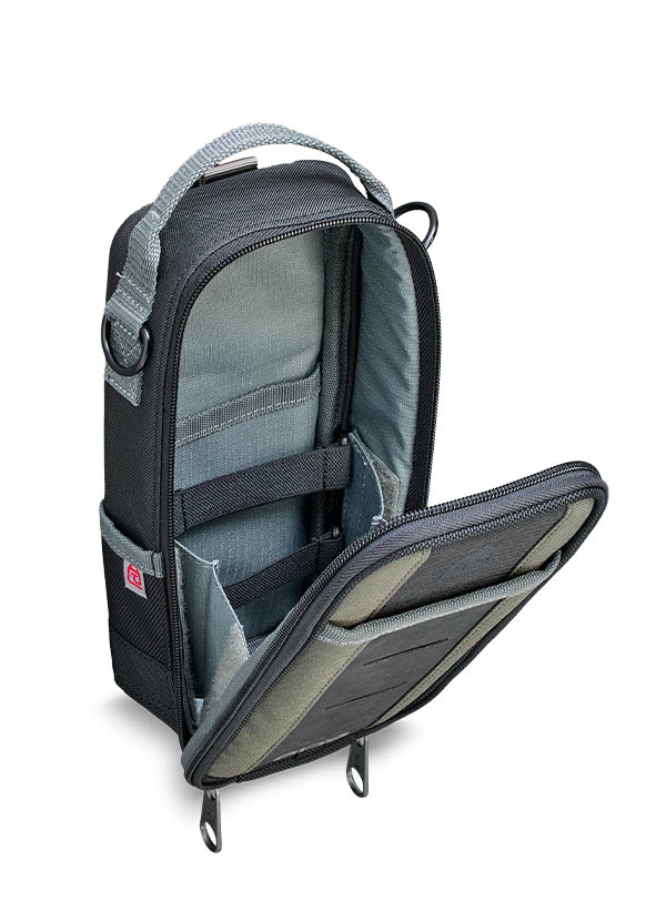 The MB-M EVO is a medium, compact meter bag designed to store a multimeter. It uses the evo system™ clip for attaching the pouch to a larger bag with an evo system™ dock, a belt, trouser pocket, or for magnetic mounting to surfaces inside a work van or equipment requiring service. The bag features detachable Velcro gussets that allow it to open 180°, as well as two repositionable or removable elastic straps to secure the meter for unobstructed use while the pouch is open. Other features include an internal elastic strap for leads, five internal and external pockets for extra storage, external MOLLE for attaching items with a belt clip, and a low-profile carrying handle. The MB-M EVO can accommodate multimeter dimensions up to 10″ x 4-1/4″ x 2-1/4″.