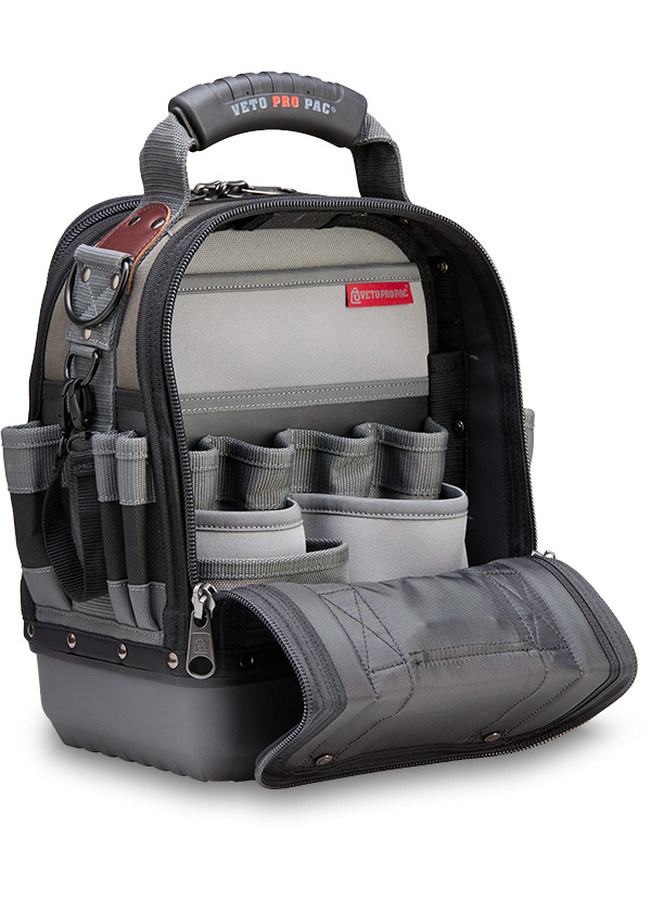 The TECH-MCT RB is a full-featured, compact tool bag offering 12” (30cm) of interior vertical storage space zipped up to accommodate longer shanked tools and meters. Includes Veto’s patented center panel, heavy duty construction, and over-molded TPR rubber waterproof polypropylene base to prevent the bag from sliding and scratching floors or countertops. With 35 interior pockets and 9 exterior pockets, stainless steel tape clip and electrical tape strap, the TECH-MCT offers maximum tool storage capacity in a compact, durable MC platform.