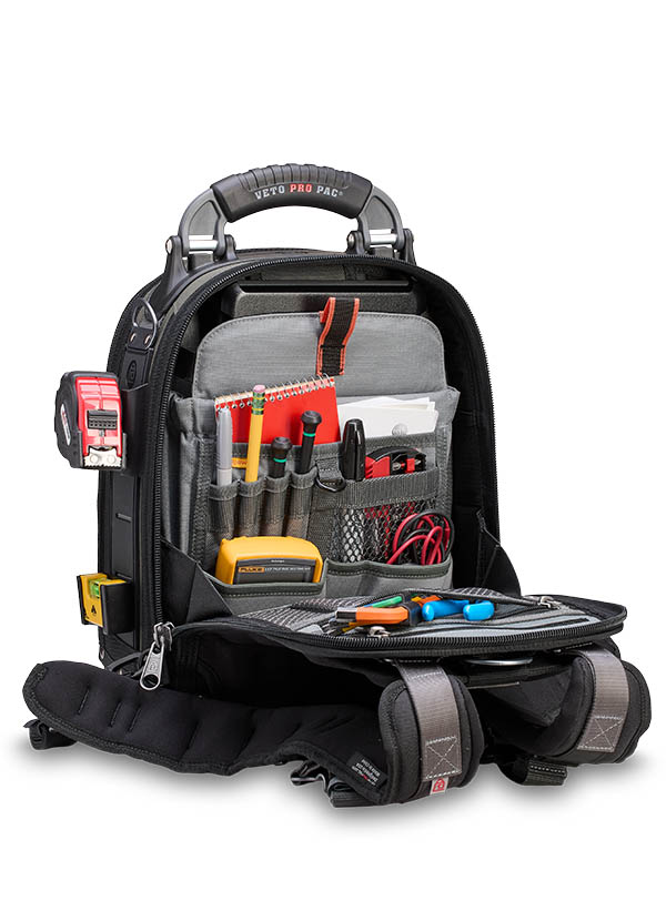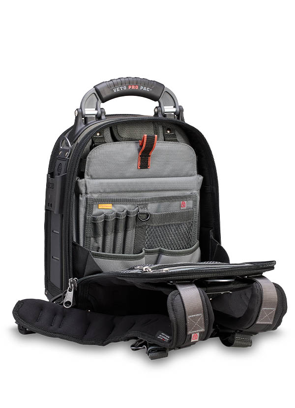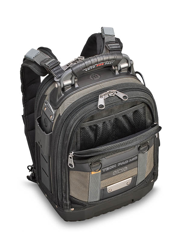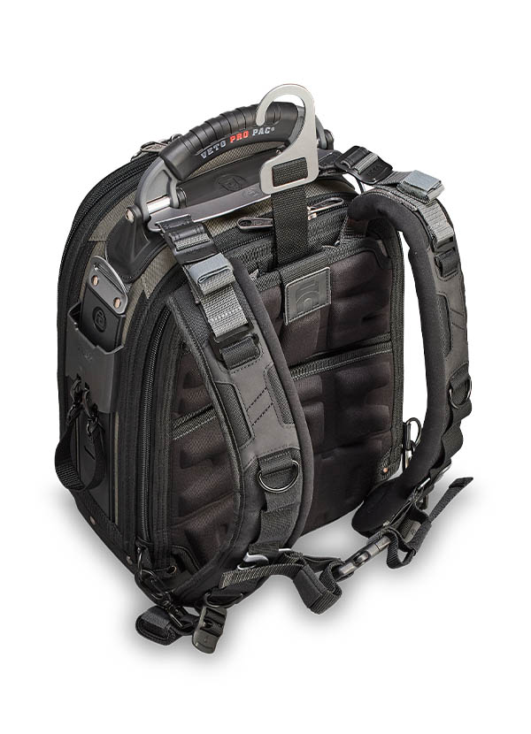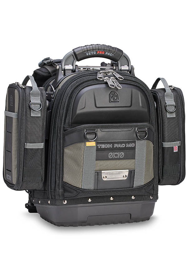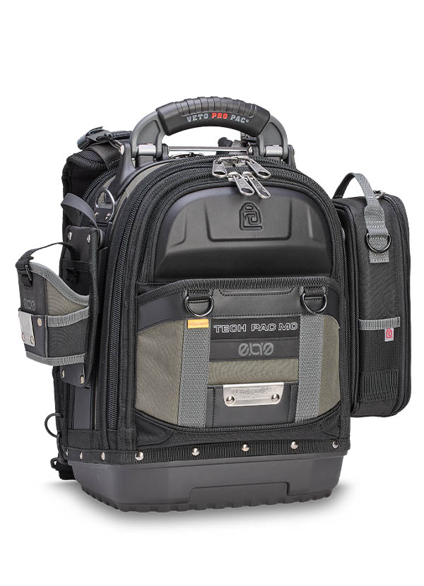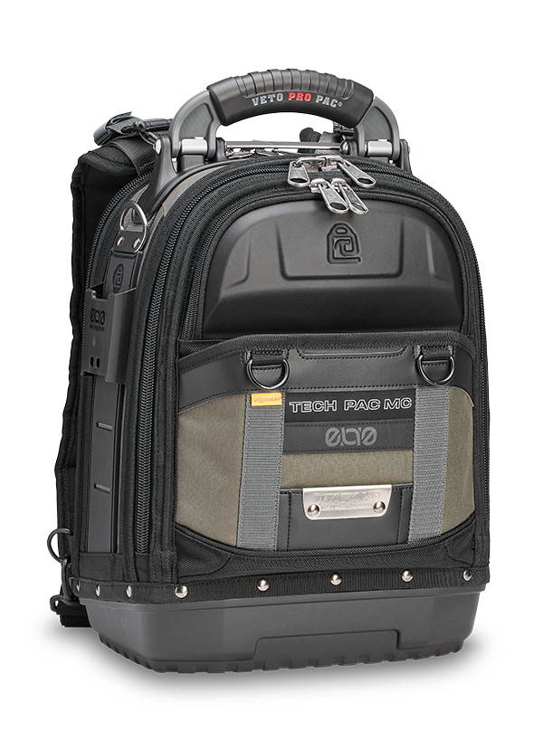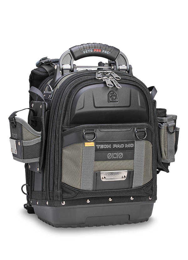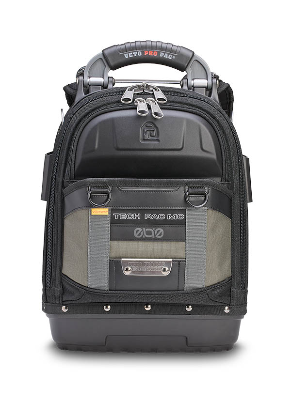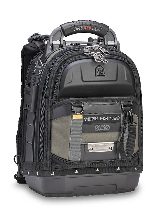 The TECH PAC MC EVO is a compact tool backpack and part of Veto Pro Pac’s new modular evo system™. It includes two evo system™ docks for securely attaching pouches with the evo system™ clip or other items with belt clips such as pouches, tape measures & pocket levels, or included electrical tape storing strap. The bag also features two strips of molded vertical MOLLE for additional clip attachment points, a rugged thermoformed front-access pocket, a large front sleeve pocket for storing items such as a parts box, hoses, or cables, a trolley handle pass-through, and premium removable backpack straps with extra padding and reinforced materials for enhanced durability and comfort. The TECH PAC MC EVO also features Veto Pro Pac’s proprietary V-SWAP™ system of interchangeable panels and comes with the Tool Panel and Meter Pocket Panel. Additional panels are sold separately, enabling alternative configurations for tool, gear, or job-specific storage solutions.