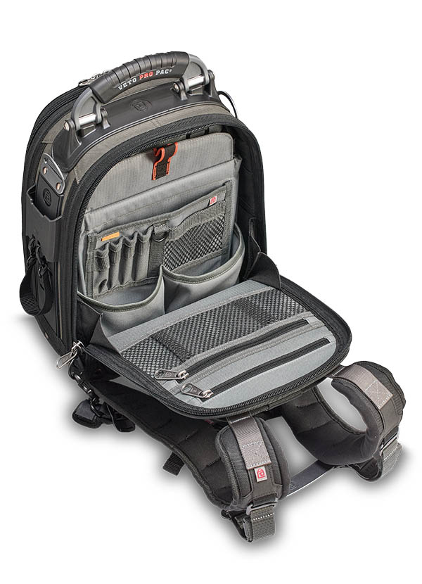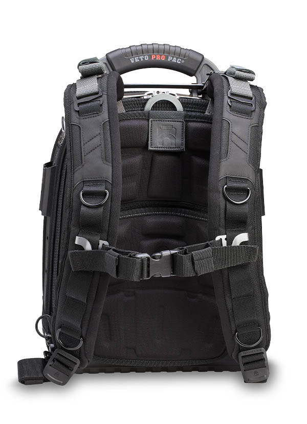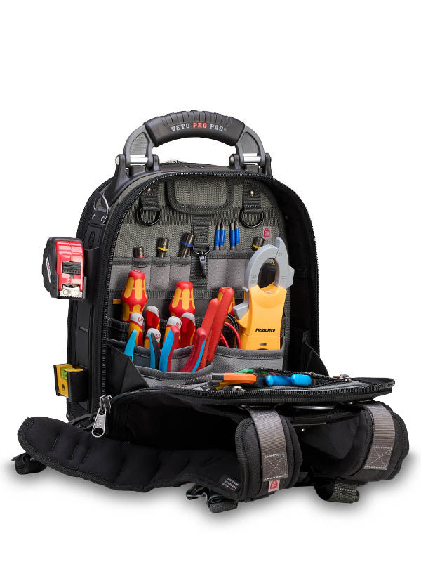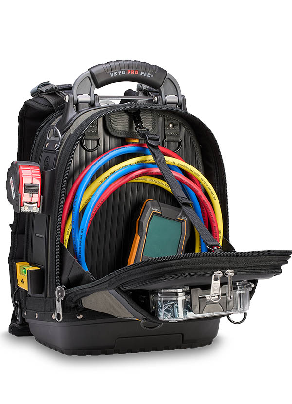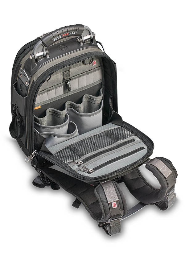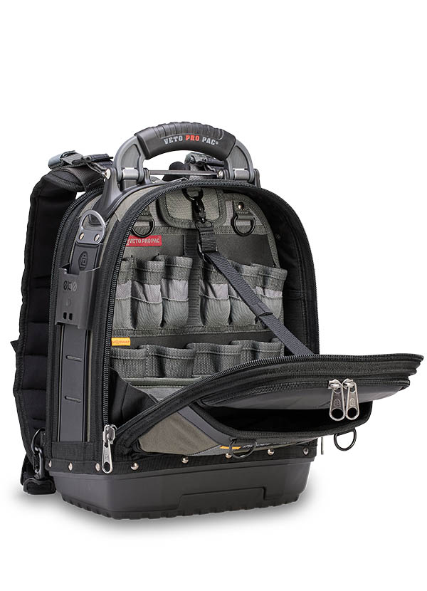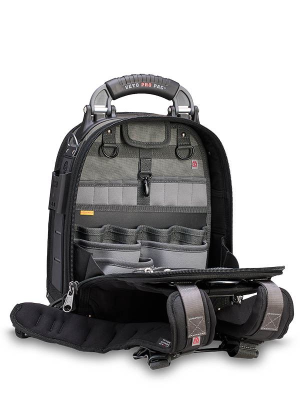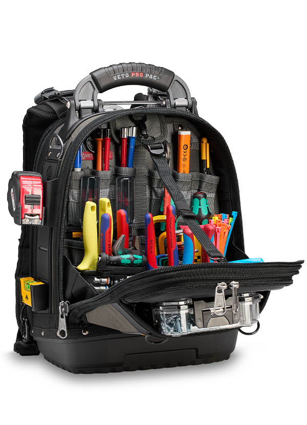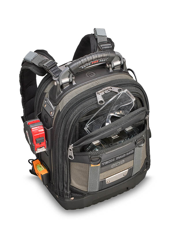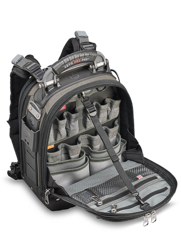 The TECH PAC MC EVO is a compact tool backpack and part of Veto Pro Pac’s new modular evo system™. It includes two evo system™ docks for securely attaching pouches with the evo system™ clip or other items with belt clips such as pouches, tape measures & pocket levels, or included electrical tape storing strap. The bag also features two strips of molded vertical MOLLE for additional clip attachment points, a rugged thermoformed front-access pocket, a large front sleeve pocket for storing items such as a parts box, hoses, or cables, a trolley handle pass-through, and premium removable backpack straps with extra padding and reinforced materials for enhanced durability and comfort. The TECH PAC MC EVO also features Veto Pro Pac’s proprietary V-SWAP™ system of interchangeable panels and comes with the Tool Panel and Meter Pocket Panel. Additional panels are sold separately, enabling alternative configurations for tool, gear, or job-specific storage solutions.