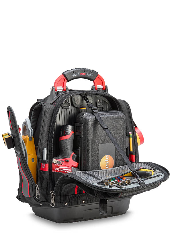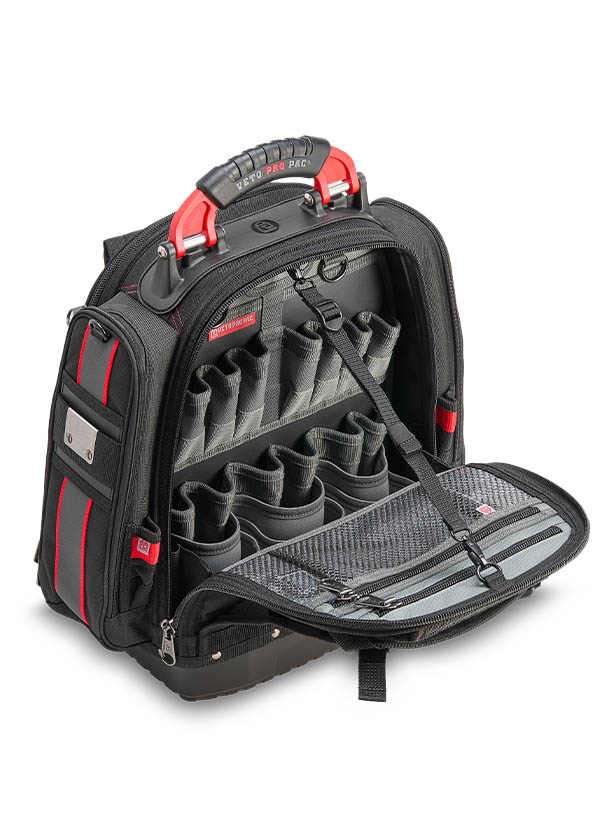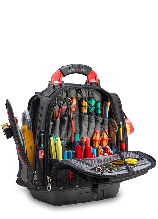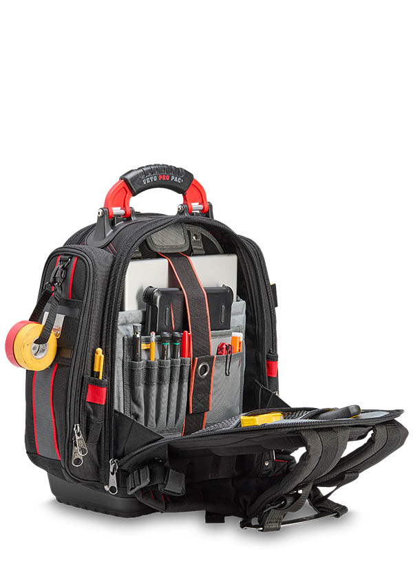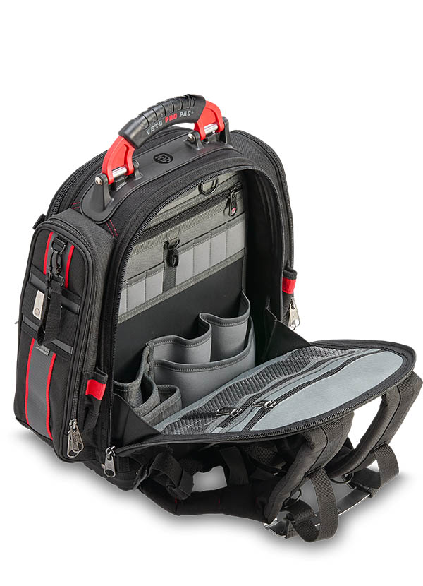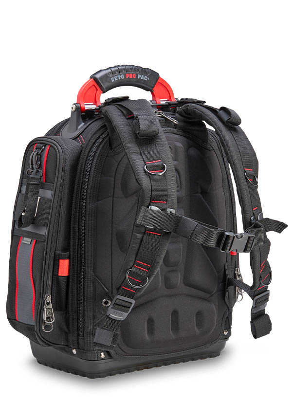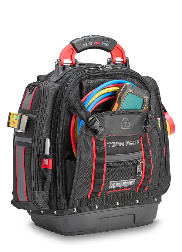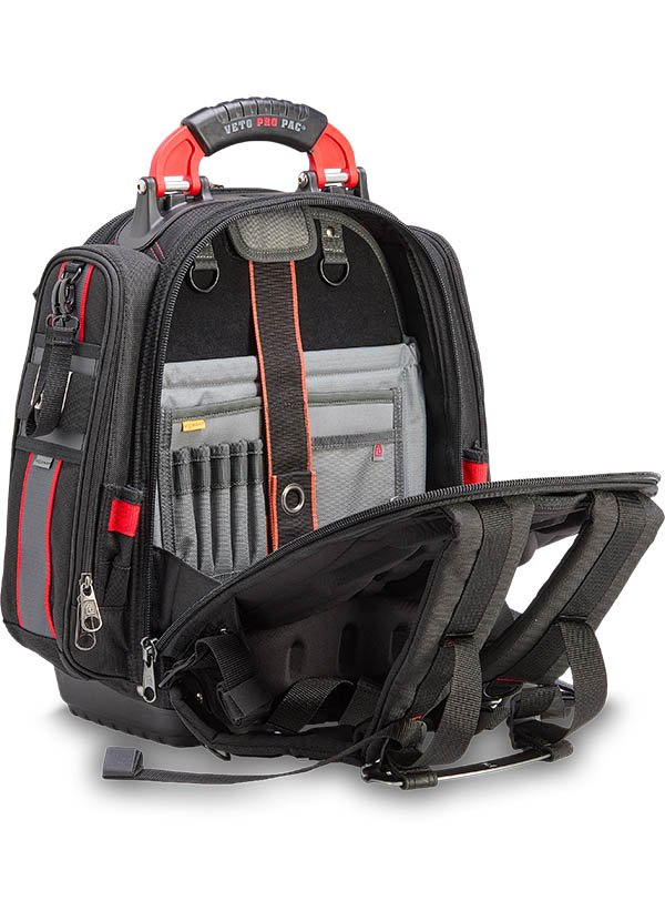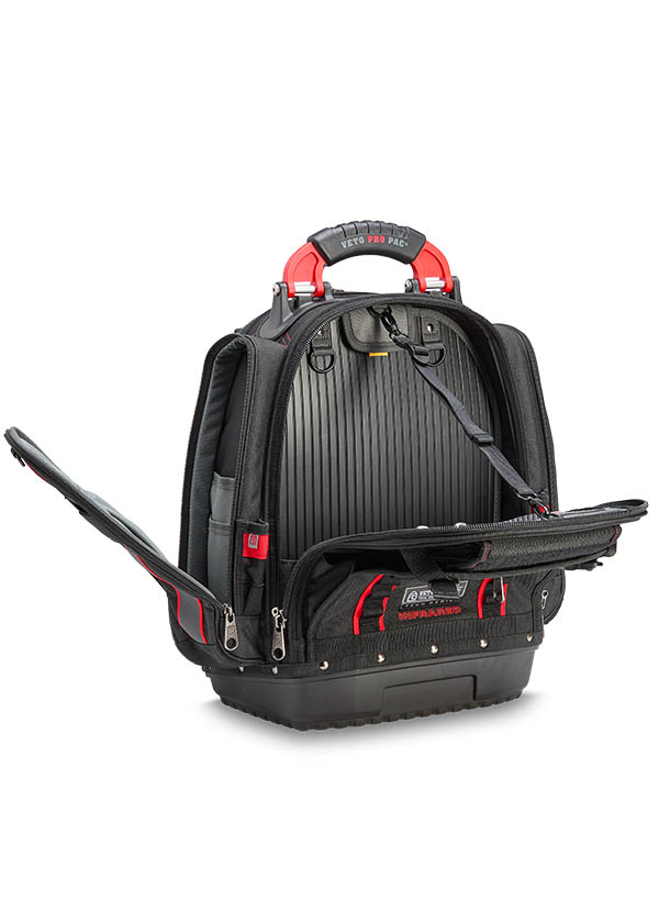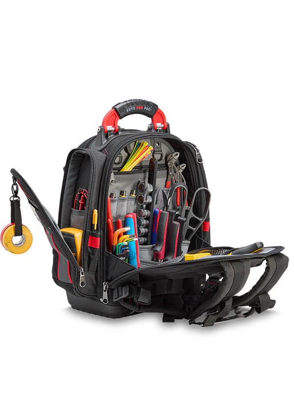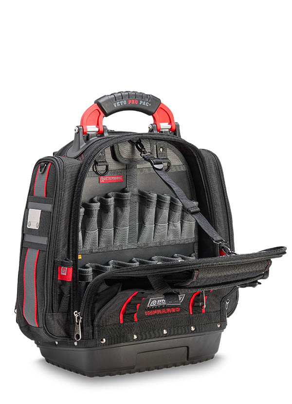 The TECH PAC P INFRARED is a large tool backpack in the new black and red color scheme. Identical in construction and storage capacity to the TECH PAC BLACKOUT, with the addition of side pockets for separate meter or tool storage. Each zippered side pocket measures 13″ x 4″ x 2″. The bag also features external daisy chains for attaching pouches and accessories, as well as Velcro ideal for personalizing with morale patches. The TECH PAC P INFRARED features Veto Pro Pac’s proprietary V-SWAP™ system of interchangeable panels and includes the Tool Panel and Meter Pocket Panel. Additional panels are sold separately, allowing alternative configurations to enable tool, gear, or job-specific storage solutions.
