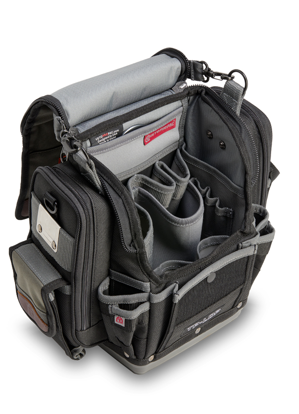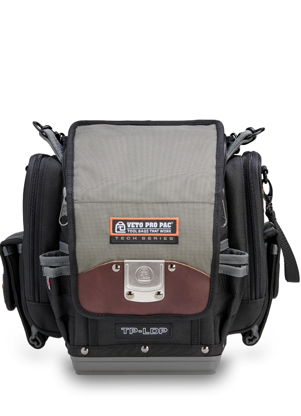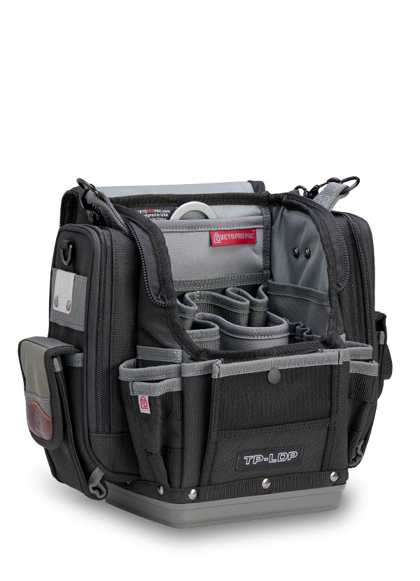 The TP-LDP is a one-sided, closeable, large service technician tool pouch designed with integrated, side-mounted, padded meter pockets. Each zippered meter pocket securely fits meters up to 8″ (203 mm) x 3.5″ (90 mm) x 2″ (50 mm). The TP-LDP is ideal for technicians who need a compact tool storage bag with dedicated compartments for test equipment. Features include an injection-molded base, rear tablet pocket, “hang-up” hook, detachable padded shoulder strap, and over-molded carrying handle.