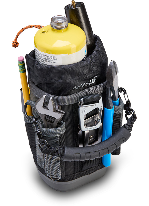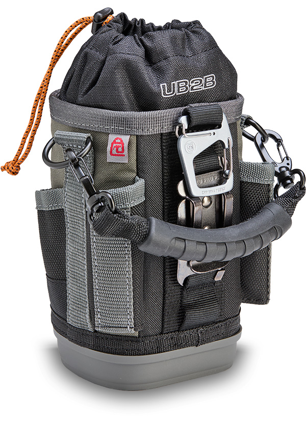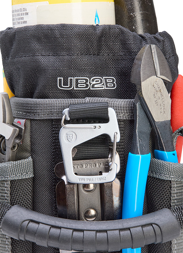 The UB2B is a medium, compact utility bag featuring an expandable or closeable cinch-top bulk storage compartment with a water/oil resistant interior for easy clean up, perfect for storing fasteners, hand tools, a multi-meter, a water bottle (up to 3.5” / 8.9cm diameter), a map gas tank, etc. Built to handle any environment, it’s equipped with an impact and water-resistant, injection-molded base that keeps the bag standing. For added versatility, the UB2B features a stainless- steel tape measure clip and 4 external pockets: 2 pass-through pockets for long hand tools, and 2 standard pockets for smaller tools. It also includes a detachable over-molded grip handle, a Repositionable Belt Clip (RBC) for securing the bag to a belt or larger tool bag, and a dual-gated carabiner for an alternative attachment option.